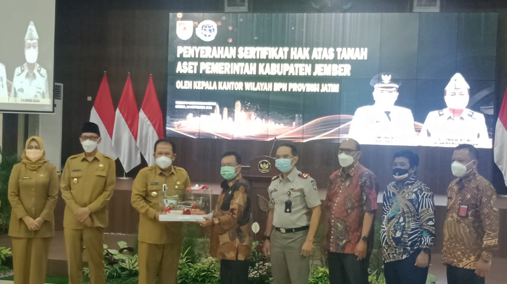Kepala Kantor Wilayah (Kakanwil) BPN Jatim, H. Jonahar menyerahkan sertifikat yang diwakili oleh Bupati Jember H. Hendy Siswanto di Pendopo Wahyawibawagraha, Selasa, (14/9/2021).
